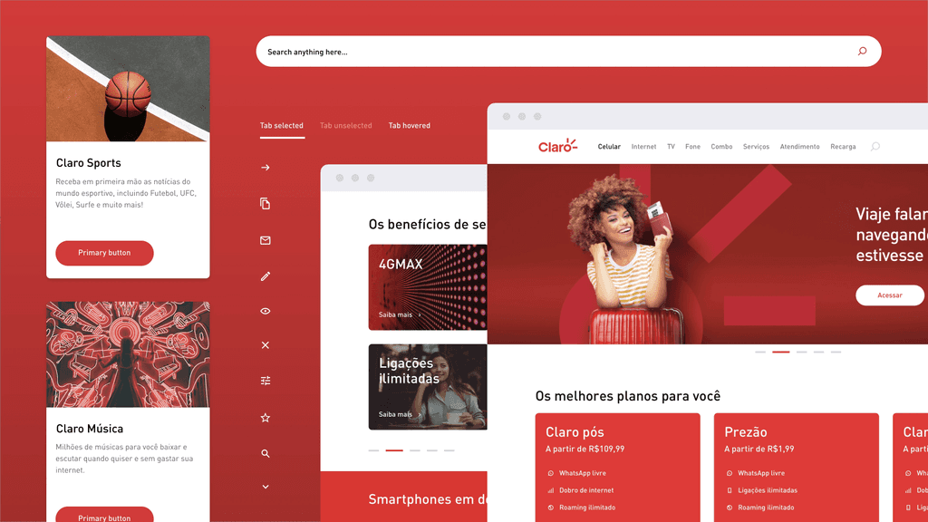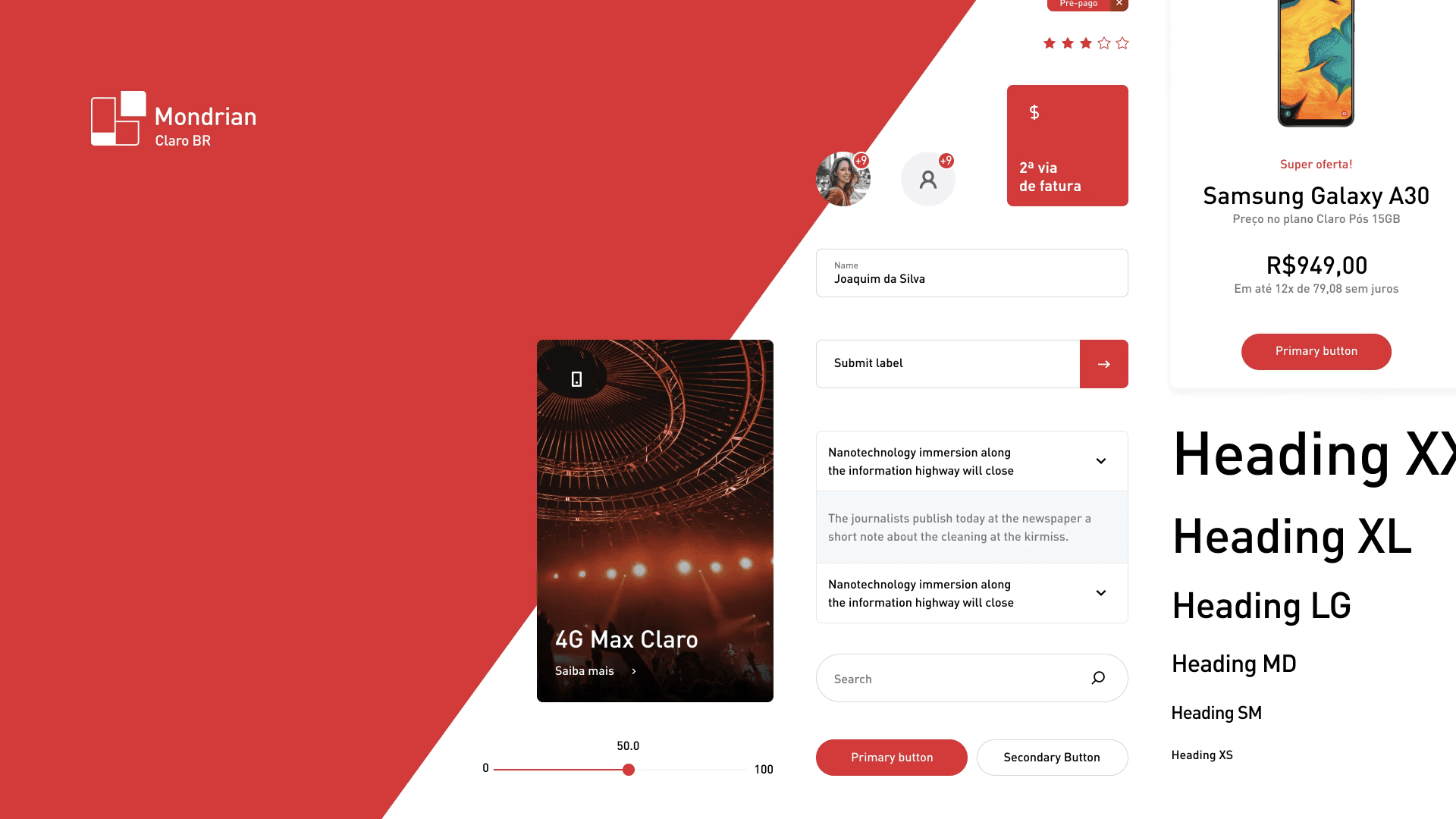 The culmination of this journey was the implementation and evolution of Mondrian, the Design System owned by Claro. In a technology transition scenario - migrating from Adobe XD to Figma and keeping the legacy in Sketch - my responsibility was to ensure technical parity of components across multiple tools without disrupting the delivery path. The focus was on creating a resilient library, where accessibility and responsive design were native premises, not afterthoughts.